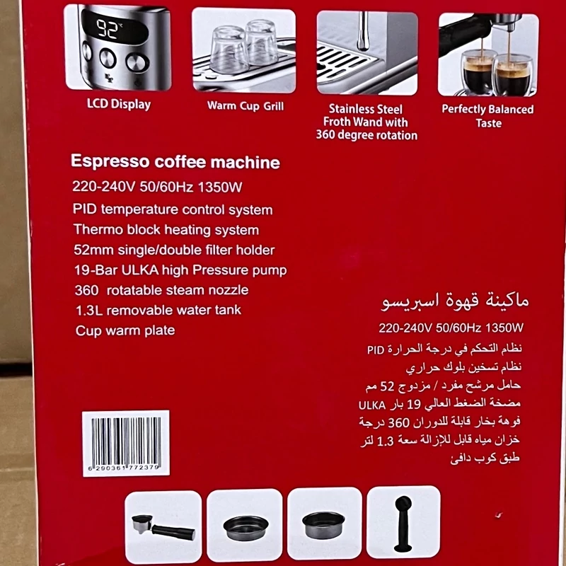 متاسفانه این کالا در حال حاضر موجود نیست. میتوانید از طریق لیست بالای صفحه، از محصولات مشابه این کالا دیدن نمایید.برند: مباشی توان موتور: 1350 وات فشار بخار: 19 بار جنس بدنه: تمام استیل ضدزنگ ظرفیت مخزن آب: 1/5 لیتر سیستم قطع کن خودکار عصاره گیری: دارد سیستم کاپوچینوساز: دارد سیستم خاموشی خودکار: دارد نشانگر سطح آب: دارد قابلیت تولید فوم شیر: دارد نازل بخار: دارد سینی چکه گیر: دارد سیستم گرمکن فنجان: دارد قابلیت تنظیم میزان بخار: دارد نمایشگر دیجیتال: دارد پایه لرزه گیر: دارد اقلام همراه: پرتافیلتر سایز 51، بسکت تک و دبل شات، تمپر پیمانهای پلاستیکی نوشیدنی های قابل تهیه: اسپرسو، لاته، کاپوچینو و...